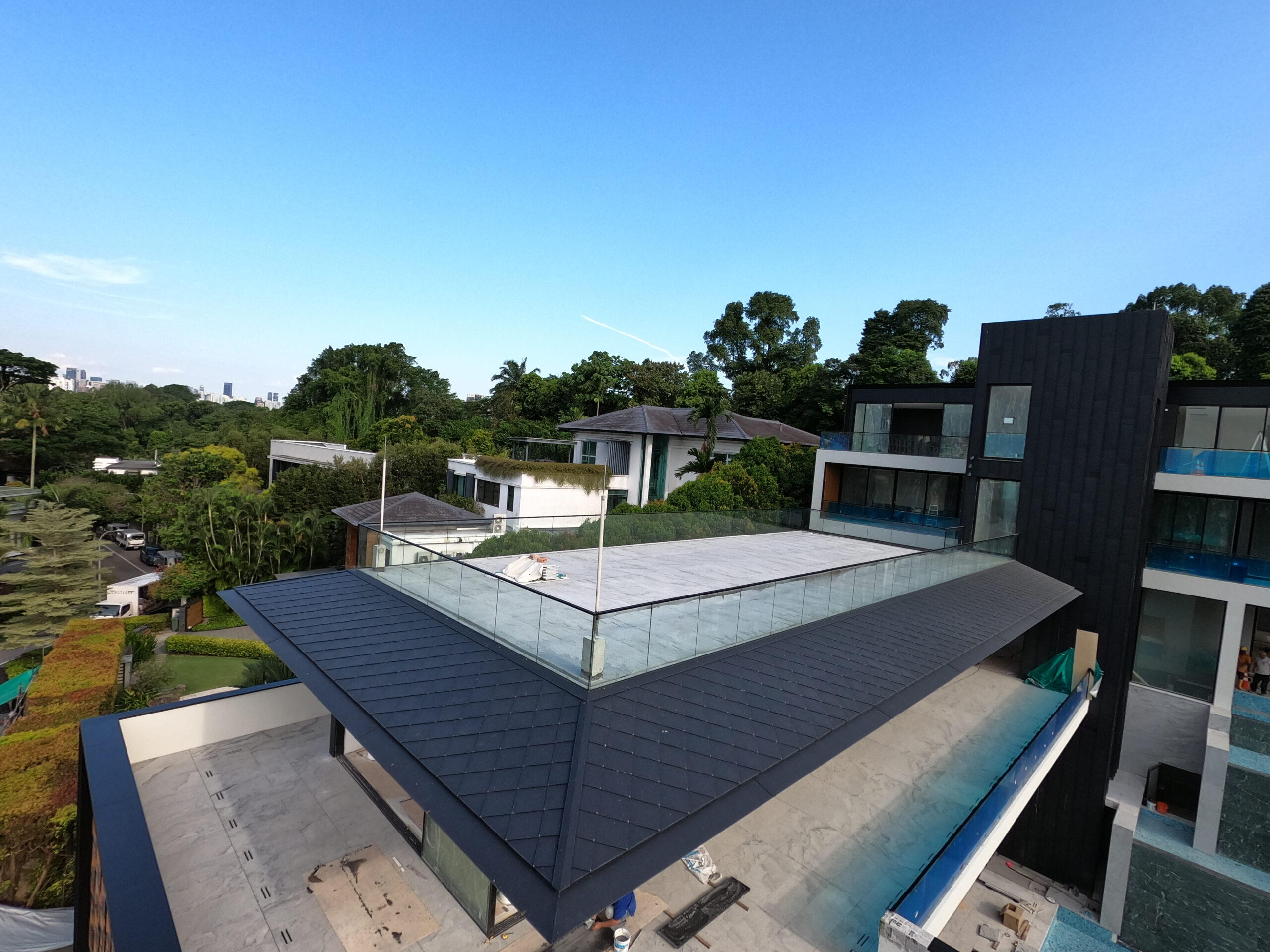 System: Diamond Flat Seam Shingles with custom-made roof edge profile